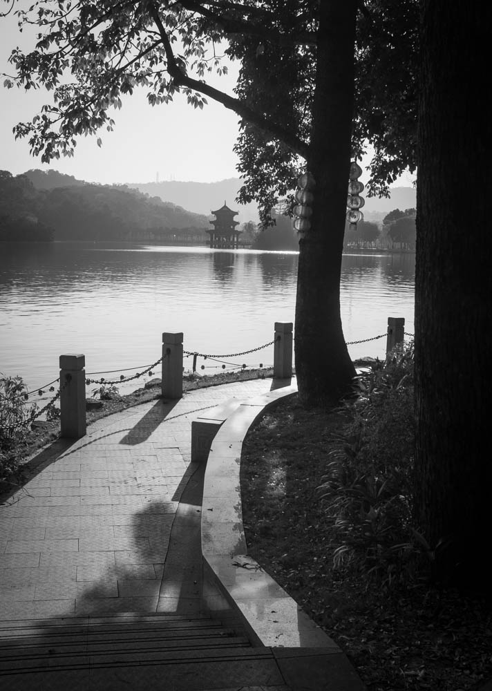 Caption: A path curves toward still water — where ancient pavilions meet modern hills. The past doesn’t fade here; it leans in, softly.