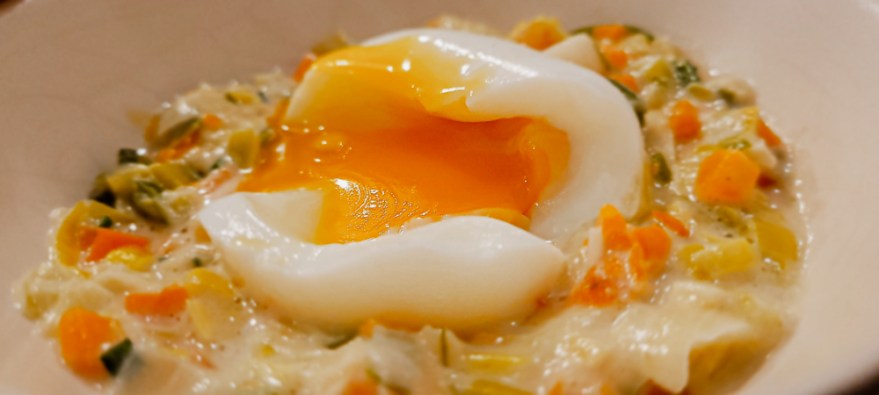 A very nice waitress came to see me and asked me whether I was ready for the next plate. What a sweetie, knowing exactly what to say to make me happy. Out came a very timid, yet heartfelt, “yes please!” Back she came with “la suite.” A parboiled egg that had had its shell removed, on a bed of some finely cut leek and carrots in a cream sauce. Cutting into the egg, the yolk was perfectly runny. A true taste sensation! The generous serving of smoked salmon was top-notch. Luckily, there was just enough bread to mop up the sauce and remaining yolk.