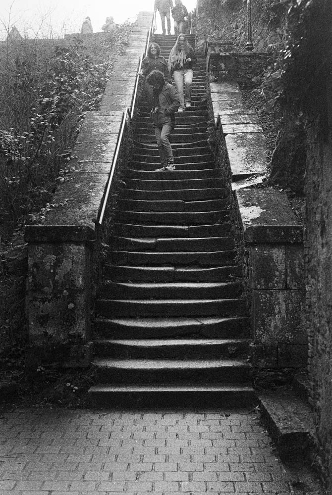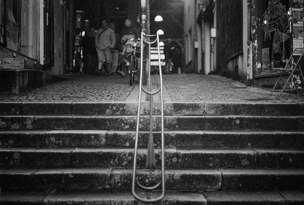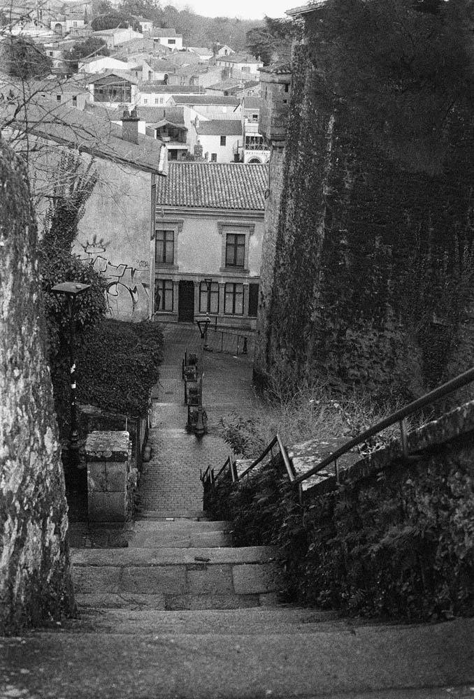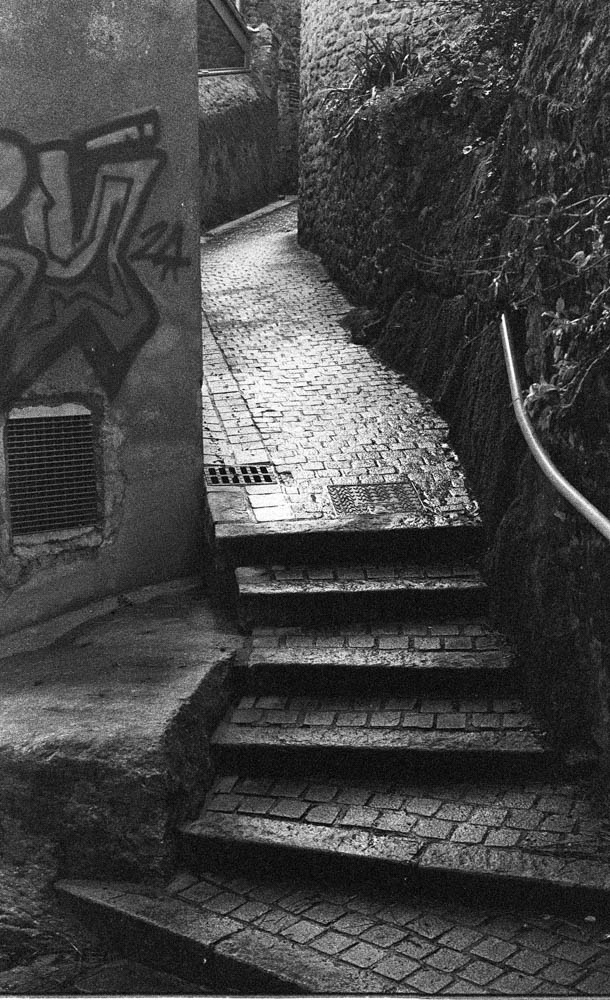 In Lightroom I only used the curves tool to pull a bit of separation between the wet stone and the grey sky. I wasn’t trying to manufacture contrast that wasn’t there. The rain had already done part of the work: cobblestones held texture because the light was even, puddles on the stairs created accidental reflections, and the streets were empty enough that I didn’t have to wait for tourists to clear the frame.