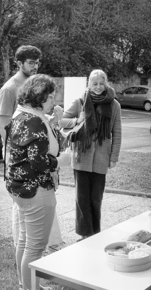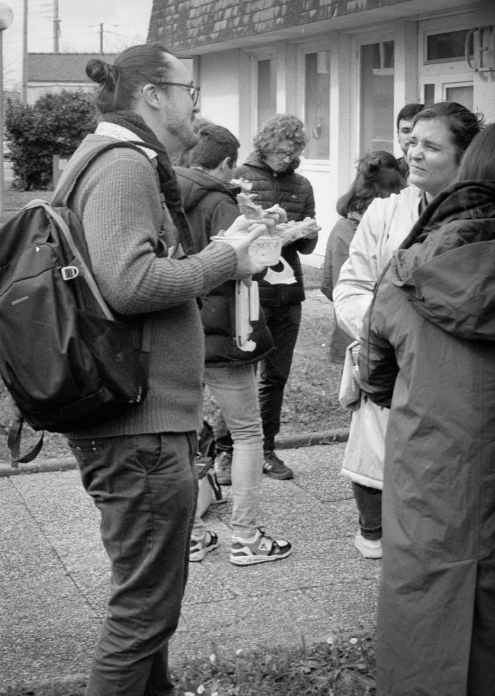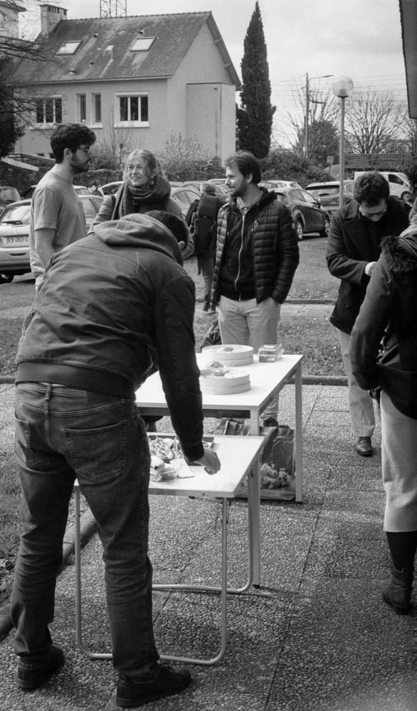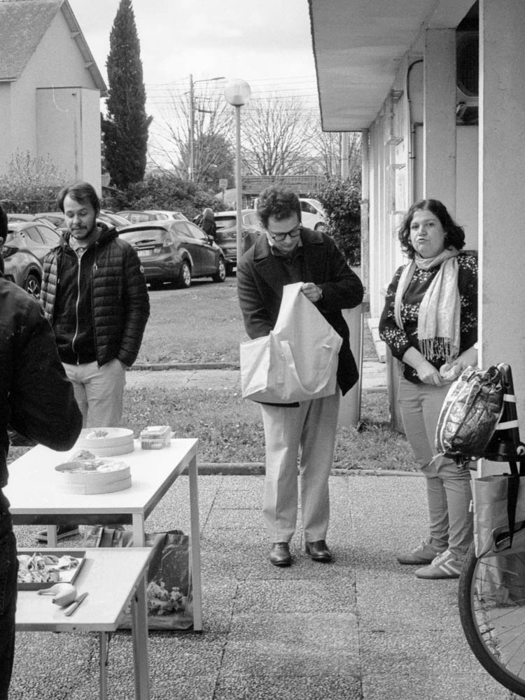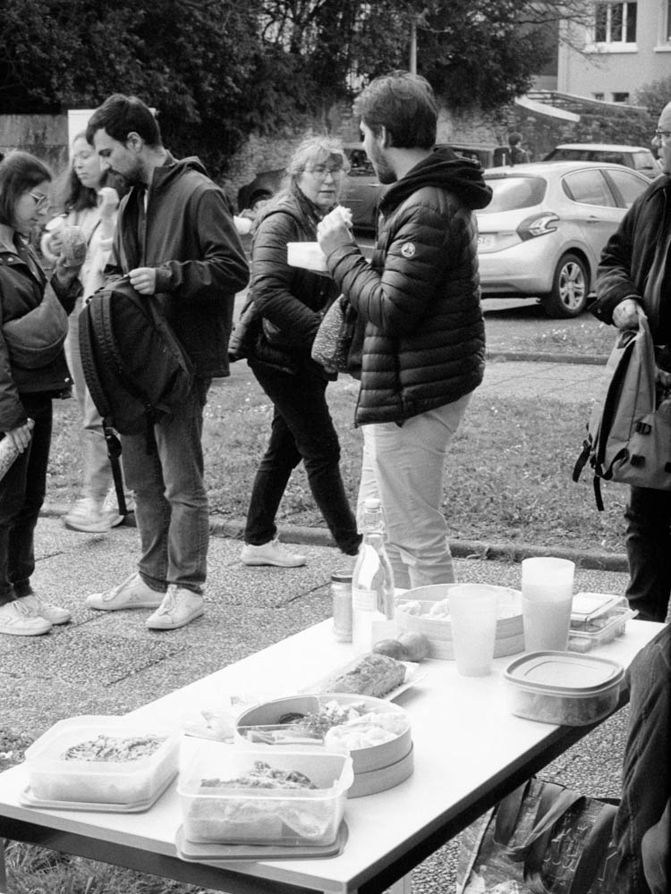 It starts simple. Tables set up outside the Centre Social. Containers unpacked. Bread unwrapped. Someone brings salad. Someone else has homemade cake. Coffee in thermoses. Water bottles. Plastic cups.