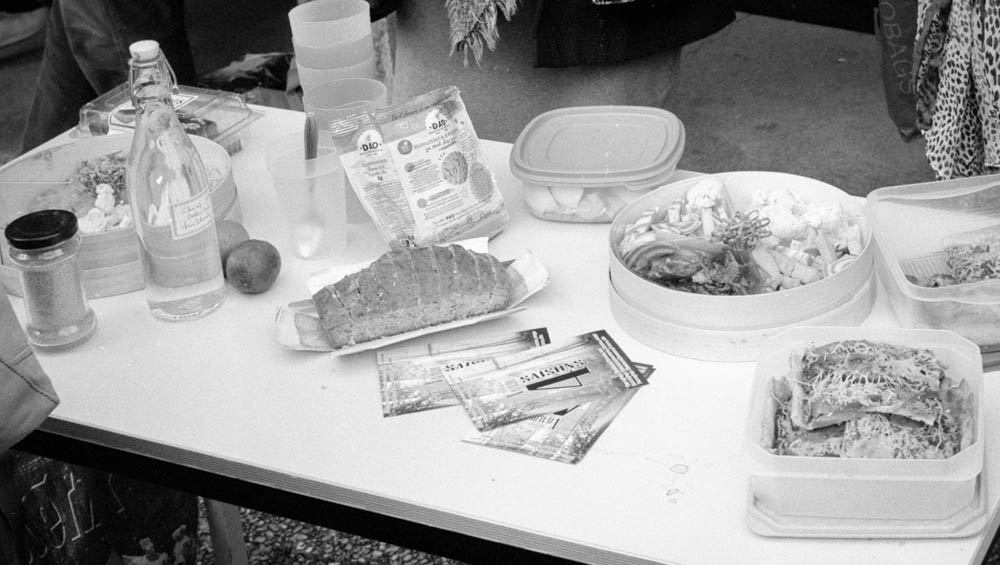 The Fomapan 100 handles it beautifully. The fine grain captures the textures—bread crust, lettuce leaves, the sheen on a plastic container. The daylight is soft, even, forgiving. No harsh shadows, no blown highlights. Just honest light on honest food.