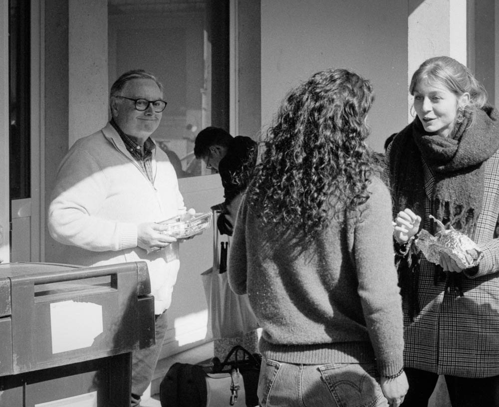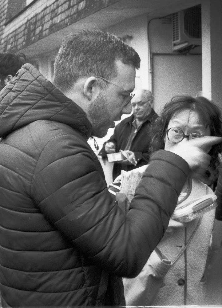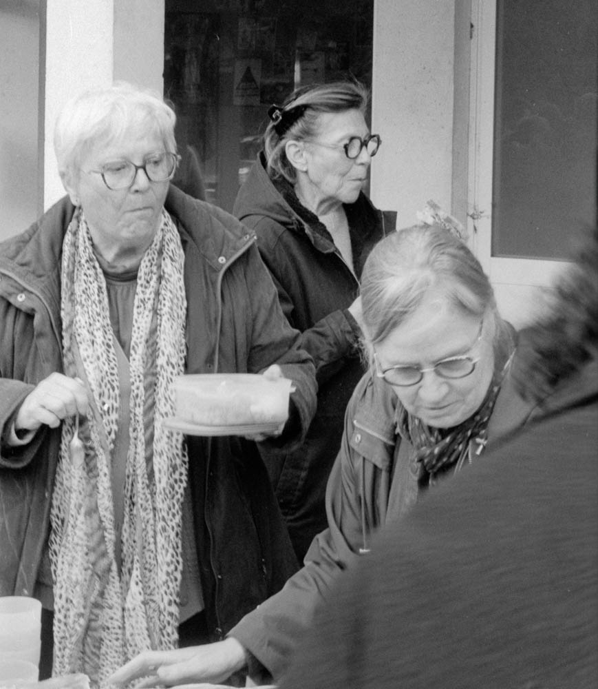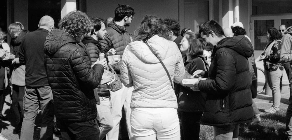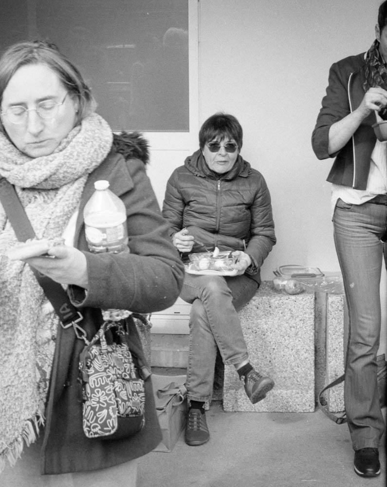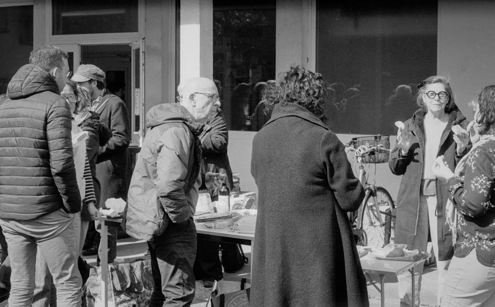 I photographed it all with the Pentax ME Super. Aperture priority, natural light, Fomapan 100 at box speed. No pushing, no games. Just clean, crisp black and white that captures the sunlight on faces, the texture of bread, the casual posture of people at rest.