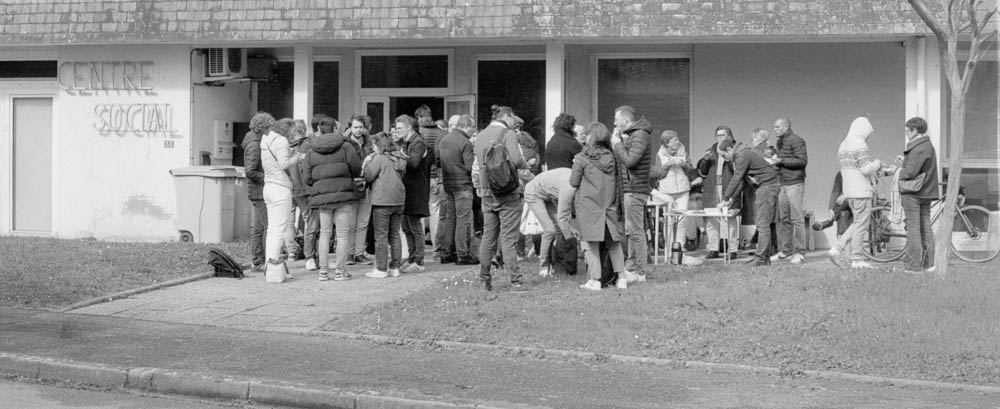 Dozens of people gathered outside the Centre Social. Some standing, some sitting on concrete blocks. Cars in the parking lot behind us. A bicycle leaning against the wall. The building’s sign—faded, weathered—reading “CENTRE SOCIAL.”