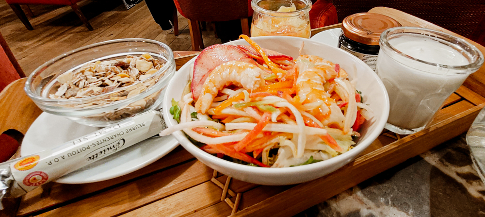 The gentleman brought me my tea, my viennoiserie, which looked perfect, and my citron, and then said, I’ll be back with the rest. The rest. Two short words hold such promise and make Ian, a very happy chappy. He came back with a tray with fromage blanc, granola, fruit salad, and my favourite jam in the whole wide world. Myrtille Jam. And a shrimp salad. There was me being even happier by the moment and remembering to take photos to show my friends in the group chat.