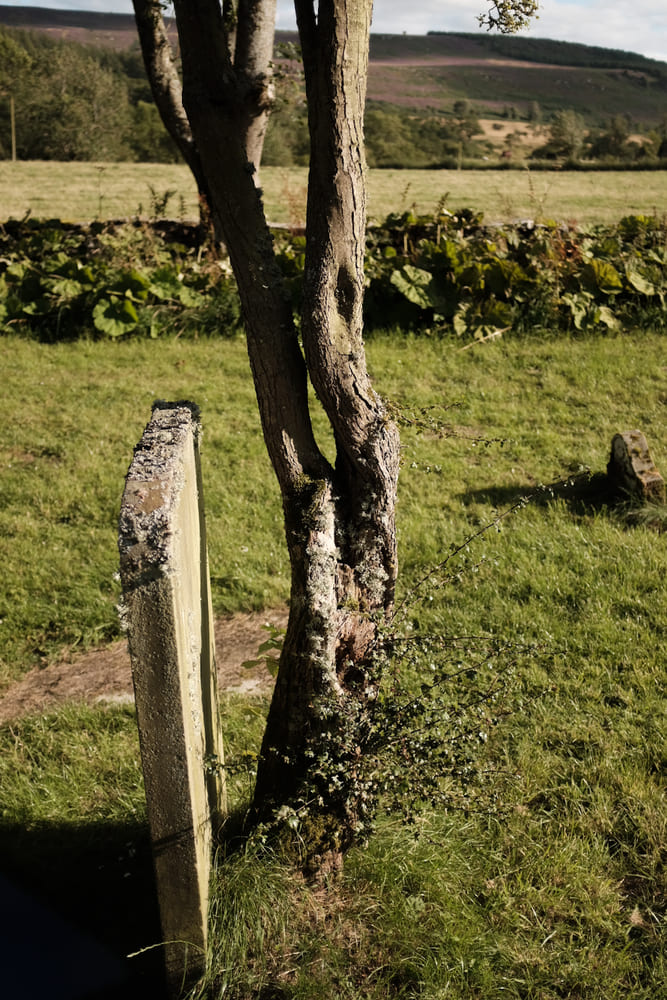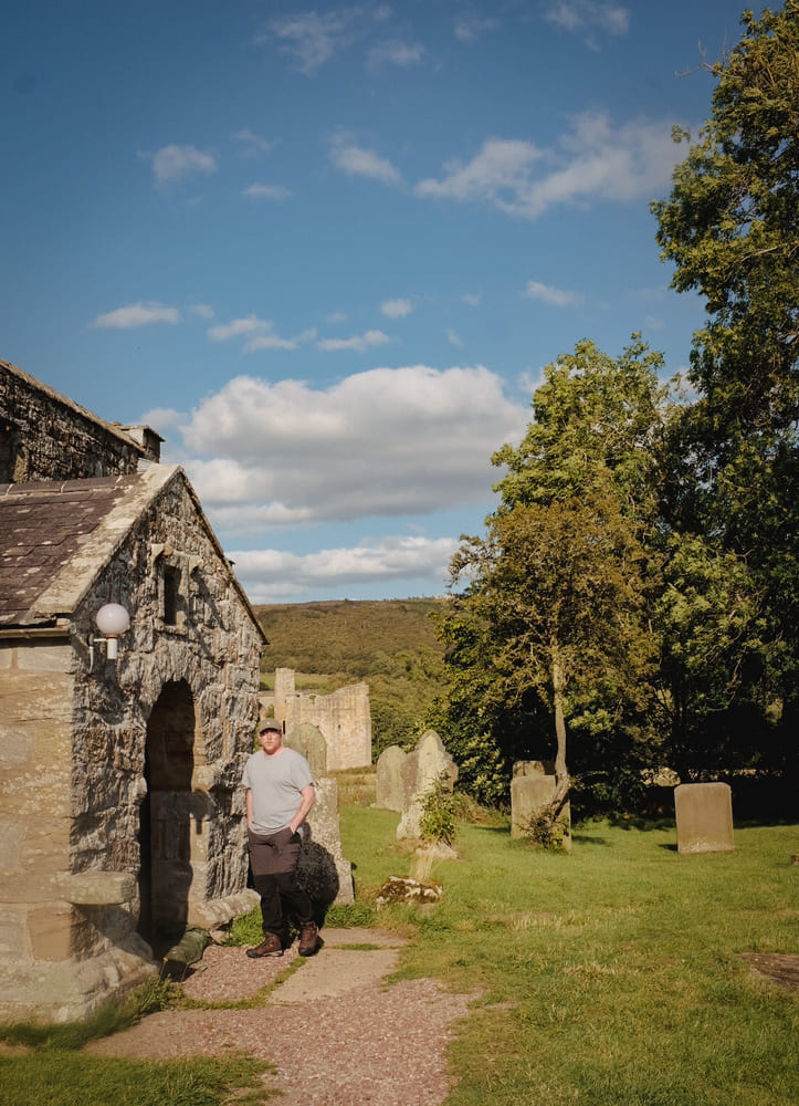 We left Rothbury behind us, feeling as if all were good in this world. Leisurely and peaceful, which felt amazing. We would head back towards Alnwick and have another look at the scenery in a new light compared with that morning. I have taken this route a few times and in the valley have always noticed a castle, and this time I thought, you know what? I’m going to have a look at that place. We saw the sign to the village of Edlingham and its 14th-century castle and turned left. You park just in front of the church, and you can go and see the ruins. We went into the church and saw somebody taking photographs with an old film camera. This guy had a vintage Nikon, and it looked beautiful. As photographers will do, we started talking shop. We talked about the films we used and how my X100F, although not a film camera, was the nearest thing I had found to a film camera in its feel and use. The photographer mentioned that the castle ruins were propped up with large iron beams, which seemed to detract from their historical charm. So, we decided to skip the visit. We parted ways and left the church after having managed to capture a couple of photos. Killian came running back in to ask the guy if he had a Nissan. He did. Well, in that case, it was his car that had just smashed into the church gate. Killian lifted the damaged gate to put it against the wall, and the driver was convinced that he had put his handbrake on. The gentleman called the number on the church notice board to try and tell the vicar about what had happened, but there was no answer. We never did find out if the driver managed to reach the vicar, but it was an unexpected end to our day of exploration.