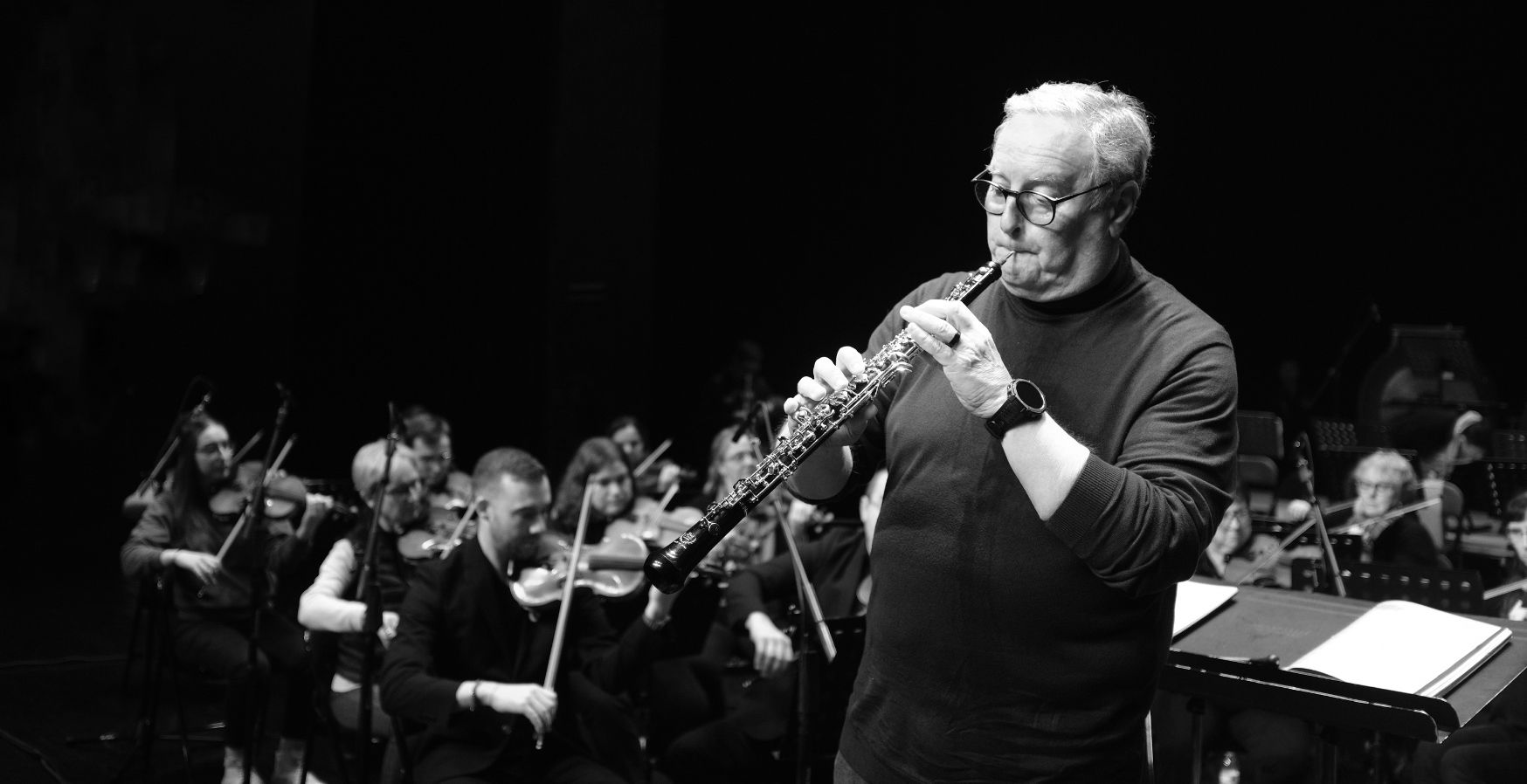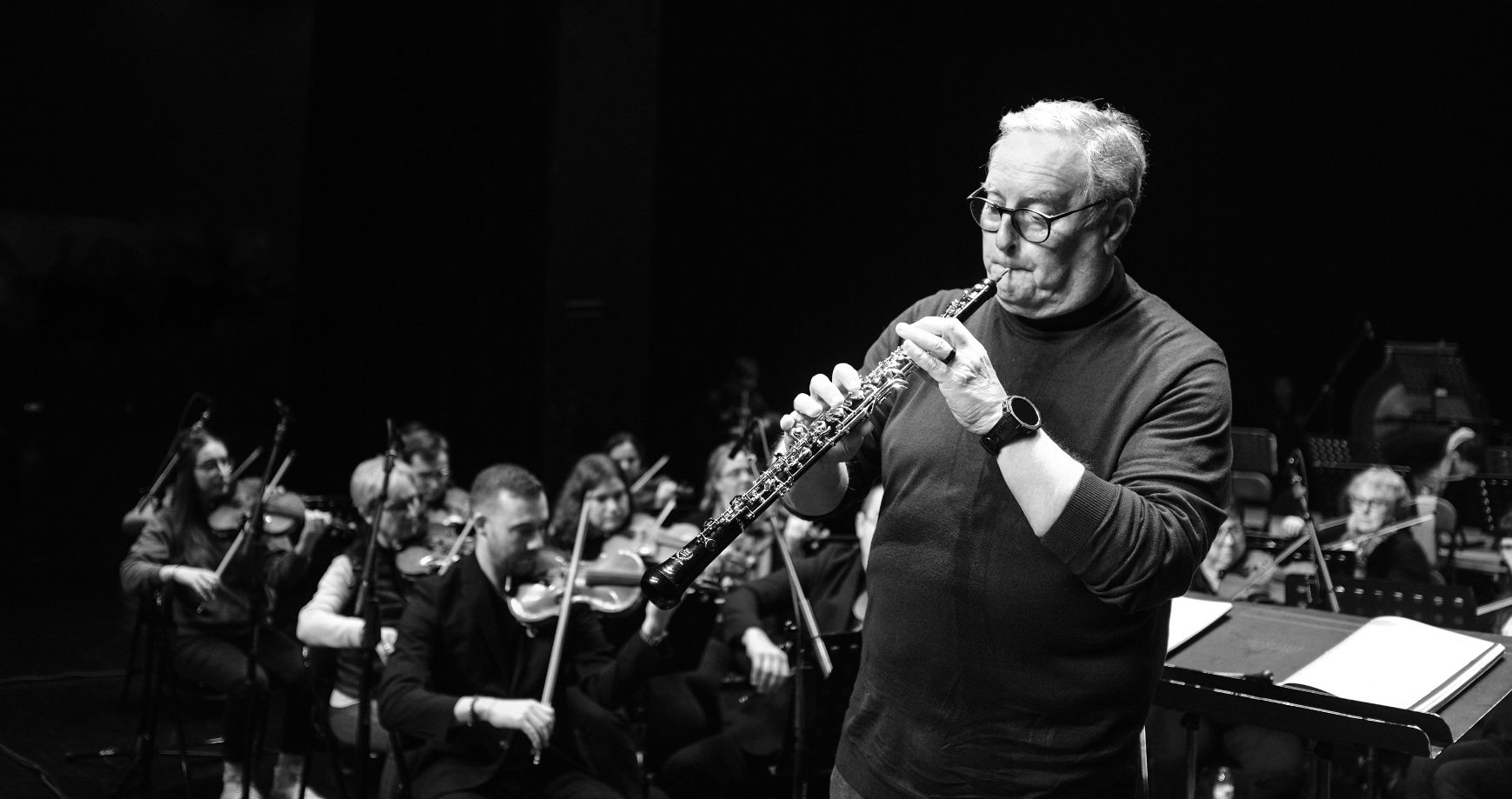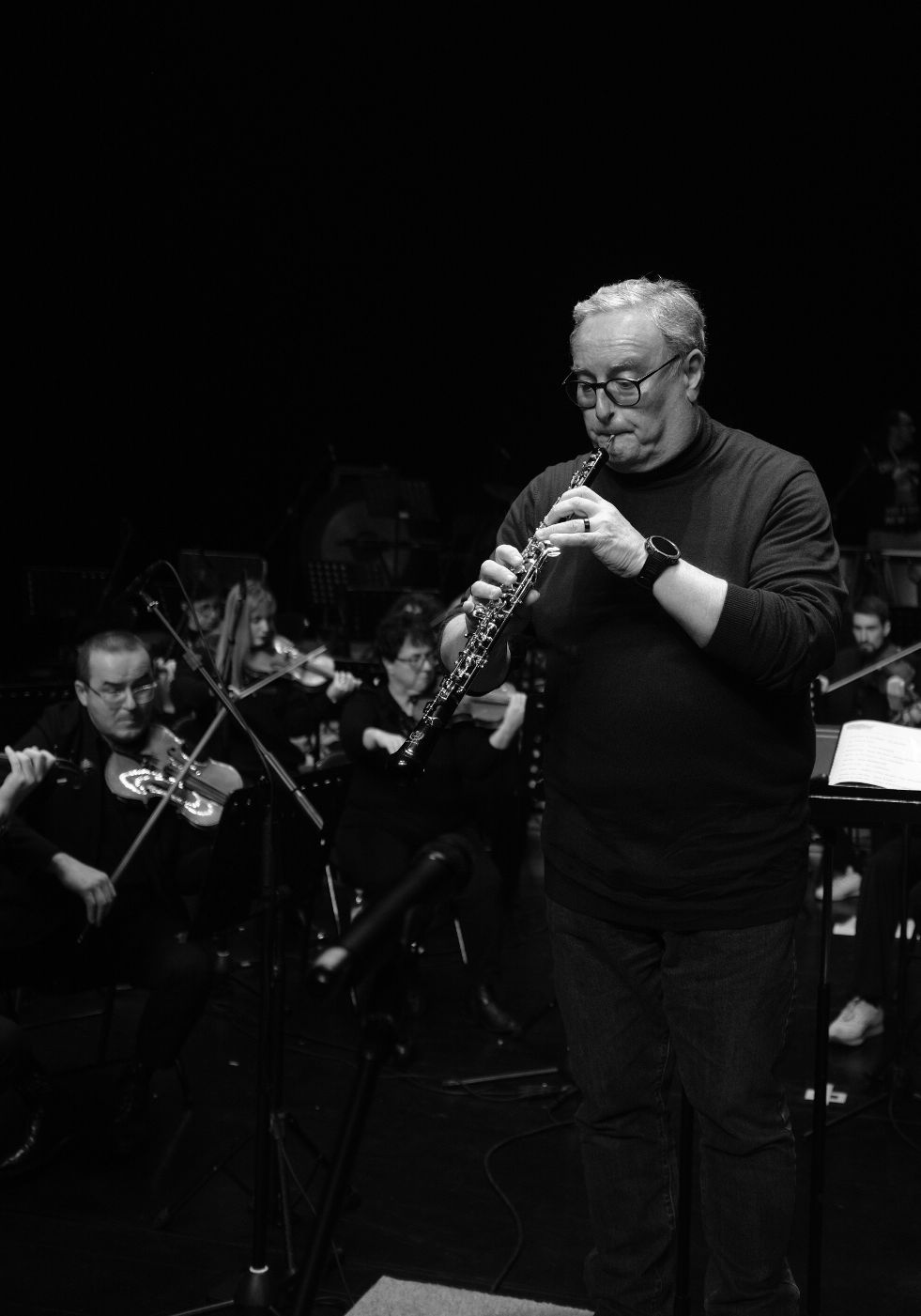 Back at the hotel, I got showered and changed into my concert suit and looked rather dashing, if I don’t say so myself. After the success of my photoshoot post-lunch, I was still on a high! Off we went to the concert venue for the evening’s performance. It was all very impressive, as was the welcome by the theatre staff. The actual stage was huge, and for the afternoon rehearsal, everything was ready for us. We just had to walk on stage and play. I could definitely get used to this. I even managed to get a few photos, including a short series of the boss playing Gabriel’s Oboe from the soundtrack of the film “Mission.” Not the impossible one, I hasten to add.